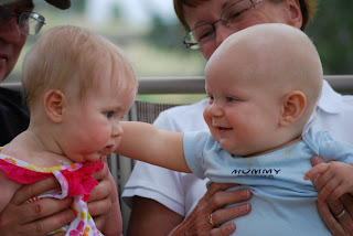 A while later I found my mom and dad hangin' with the wee ones. How big will they be the next time they see each other? Will they be crawling, walking? It is amazing to see how life changes over the course of a few years. We used to get together as a family, sit outside and chat for hours. Now, someone is chasing someone. A little boy just pooed his pants. Grandpa has spit-up all over his sleeve. It's nap time, bed time, time-out time.